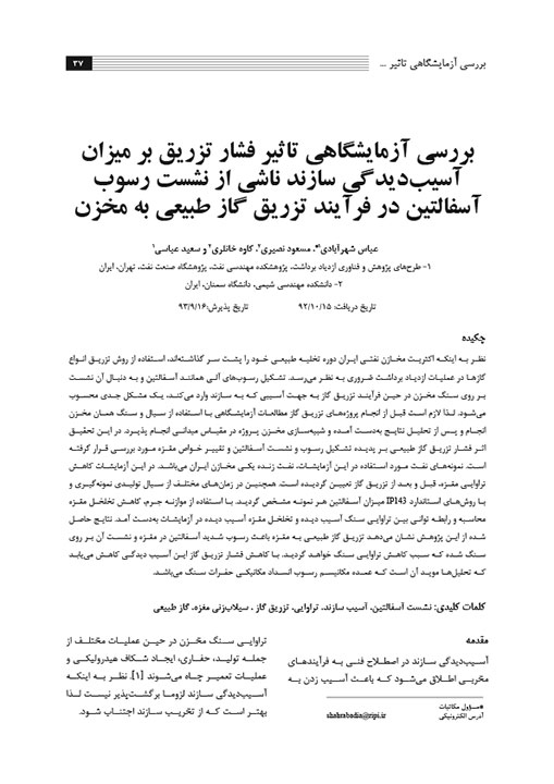 بررسی آزمایشگاهی تاثیر فشار تزریق بر میزان آسیبدیدگی سازند ناشی از نشست رسوب آسفالتین در فرآیند تزریق گاز طبیعی به مخزن
