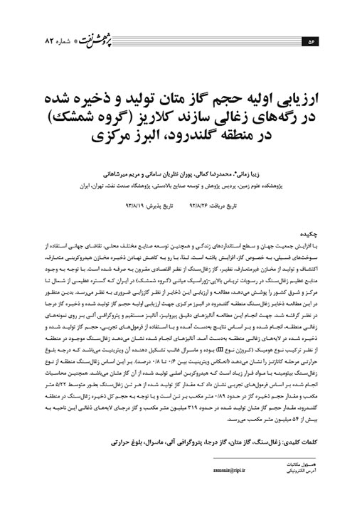 ارزیابی اولیه حجم گاز متان تولید و ذخیره شده در رگههای زغالی سازند کلاریز (گروه شمشک) در منطقه گلندرود، البرز مرکزی