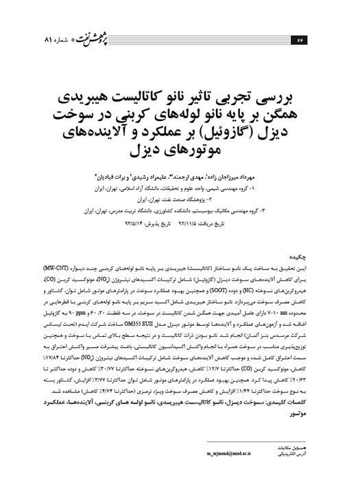 بررسی تجربی تاثیر نانو کاتالیست هیبریدی همگن بر پایه نانو لولههای کربنی در سوخت دیزل (گازوئیل) بر عملکرد و آلایندههای موتورهای دیزل
