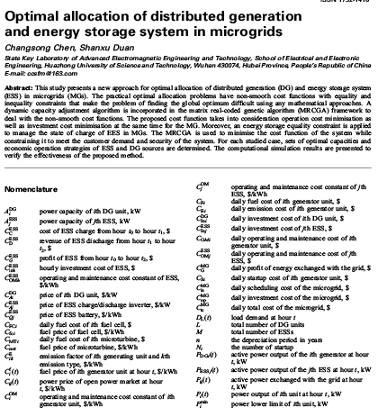 این مقاله روش تخصیص بهینه DG و ESS را در MG ها توضیح می دهد. برتری این روش نسبت به روشهای قبلی پیکربندی گنجایش بررسی تنظیم ظرفیت دینامیکی DG و ESS است که برای بهینه سازی مختصی بین پیکربندی گنجایش و برنامه ریزی کوتاه مدت سیستم های MG مناسب است . مشخصه جالب توجه روش پیشنهادی ادغام و یکپارچگی الگوریتم تنظیم گنجایش دینامیکی در ساختار MRCGA است و بدین ترتیب ، تنظیم گنجایش در تکرار حلقه ای مستقیماً با ضرایب ظرفیت انرژی بدست آمده از نتایج محاسبه جریان تک قدرتی حاصل می شود. قیدهای برابری ذخیره انرژی ESS نیز با تابع مناسبت رفع می شود. استراتژی های بررسی قیدها ضمن حفظ پروسه دینامیکی MRCGA تعبیه می شود. نتایج محاسباتی شبیه سازی نشان میدهد که تخصیص بهینه DG و ESS طبق MRCGA بدست می آیند و مجموع هزینه ها طی دوره عمر عملیات سیستم کمینه می شوند. تایید و پذیرفته می شودکه روشهای طرح شده در این کار تحقیقاتی شاخص های مهم و مفید تخصیص بهینه سیستم MG را سازگار و متناسب با رسوخ و نفوذ فراوان منابع توزیعی تجدید شدنی ارایه می دهد.
