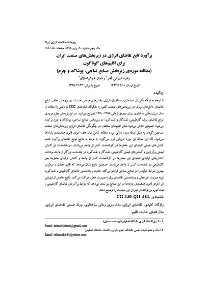 برآورد تابع تقاضای انرژی در زیربخشهای صنعت ایران برای اقلیمهای گوناگون (مطالعه موردی زیربخش صنایع نساجی، پوشاک و چرم)