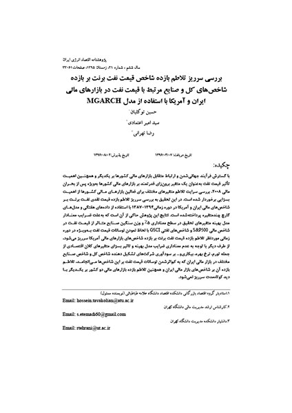 بررسی سرریز تلاطم بازده شاخص قیمت نفت برنت بر بازده شاخصهای کل و صنایع مرتبط با قیمت نفت در بازارهای مالی ایران و آمریکا با استفاده از مدل MGARCH