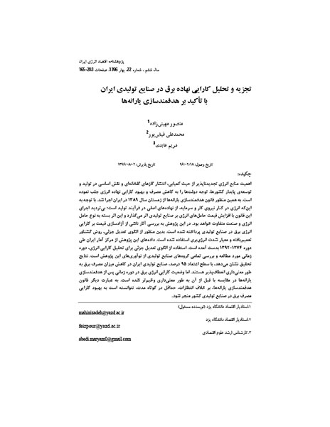 تجزیه و تحلیل کارایی نهاده برق در صنایع تولیدی ایران با تأکید بر هدفمندسازی یارانهها