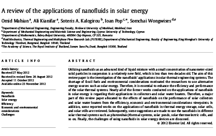 نانو سیالات ،سیالات پیشرفته ی حاوی ذرات در اندازه ی نانو هستند که در طول دو دهه اخیر پدید آمده اند.نانو سیالات برای بهبود کارایی در سیستم های مهندسی گرمایی زیادی به کار میروند.این مقاله یک نقد و بررسی از کاربردها ی نانو سیالات را در مهندسی گرمایی خورشیدی را ارائه کردند.مطالعات آزمایشی و عددی برای کلکتورهای خورشیدی نشان داد که در برخی موارد، بازده میتواند به طور قابل توجهی با استفاده از نانو سیالات افزایش یابد.البته، دریافت شده است استفاده از یک نانو سیال با کسر حجمی بالاتر همیشه بهترین گزینه نیست.بنابراین، آن حاکی از این است که نانو سیالات در کسرهای حجمی مختلف باید برای یافتن کسر حجمی مطلوب، تست شده باشند.هم چنین دیده شده است که کارهای نظری در دسترس ،نتایج مختلفی را در زمینه ی اثرات اندازه ی ذره بر روی بازده کلکتورها را ارائه میدهد (مرجع [۲۸،۲۷] را ببینید).لازم به ذکر است یک کار آزمایشی بر روی اثر اندازه ی ذره بر روی بازده کلکتور انجام می گیرد.هم چنین نتیجه گیری شده است، برخی فاکتورها همانند افزودن مواد فعال در سطح به نانو سیال و انتخاب مناسب ph نانو سیال، در بازده کلکتور موثر هستند.