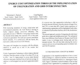 با افزایش آگاهی در زمینه ذخیره انرژی و حفاظت از محیط زیست، کشورهای عربی به سمت توسعه بازدهی در زمینه تبدیل انرژی پیش می روند. معادل ٢.٧ میلیون بشکه به صورت روزانه می سوزند تا برق کارخانه های حرارتی که نمایده ٩٢ درصد از کل تولید برق در کشورهای عربی می باشد را تامین کند. یک میلیون بشکه به طور سالانه به این مقدار اضافه می شود. که به طور معمول ۴٠ دلار در هر بشکه و هزینه روزانه آن بیش از ١٠٨ میلیون دلار می باشد. این مقاله به معرفی دو استراتژی می پردازد که هدف کلی آن این می باشد تا مصرف کنونی این سوخت را به نصف برساند. اولا، فناوری تولید همزمان قادر به بهبود بازده گرمایی از متوسط جریان کمتر از ٢۵ درصد تا بیش از ٨٠ درصد می باشد. فقط ١ درصد بهبود راندمانبازده گرمایی نیروگاه ها، صرفه جویی به اندازه ۴ میلیون دلار سوخت را نشان می دهد. علاوه بر این، تولید همزمان مناسب و سازماندهی شده باعث: – کاهش انتشار آلودگی با سوزاندن سوخت کمتر در نتیجه راندمان حرارتی بالاتر می گردد. – و باعث افزایش غیرمتمرکزسازی تولید برق می گردد.