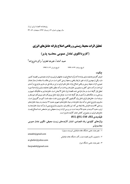 تحلیل اثرات محیط زیستی و رفاهی اصلاح یارانه حاملهای انرژی (کاربردالگوی تعادل عمومی محاسبه پذیر)