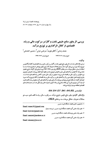 بررسی اثر وفور منابع طبیعی (نفت و گاز) بر سرکوب مالی و رشد اقتصادی از کانال اثرگذاری بر توزیع درآمد
