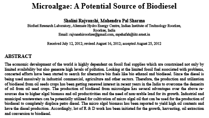 ریز جلبک به عنوان یکی از امیدوار کننده ترین مواد برای تولید بیودیزل در آینده در هند محسوب می شود. مزایای استفاده از ریز جلبک ها، دسترسی گسترده به آن، محصول روغن بیشترر و کاهش فشار بر زمین های قابل کشت است. مشکل تولید بیودیزل کارآمد از جلبک ها نه تنها در استخراج روغن، بلکه توسعه یک استرین جلبک با محتوای روغن بالا و نرخ رشد سریع است. در زمان شروع غیر قابل دسترس شدن روغن ریزجلبکی، استفاده از فرآیندهای تبدیل نوع تبادل استری می تواند برای تبدیل به بیودیزل مفید باشد که خواص سوختی مشابه با پترودیزل دارد. به غیر از فن آوری های گسترش یافته برای کشت جلبک، برداشت و استخراج روغن، فرآیندهای تبادل استری نیز مرور شده است. پایداری بیودیزل جلبکی نستا بهتر از پایداری بیودیزل مبتنی بر دانه روغنی است. وضعیت توسعه و تحقیق در مورد بیودیزل ریزجلبکی نیز در این مقاله مورد بحث قرار گرفته شده است.