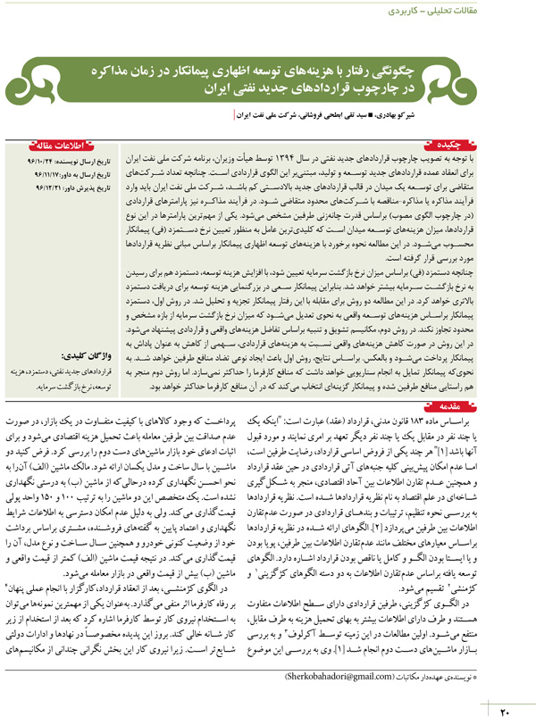 با توجه به تصویب چارچوب قراردادهای جدید نفتی در سال ۱۳۹۴ توسط هیات وزیران، برنامه شرکت ملی نفت ایران برای انعقاد عمده قراردادهای جدید توسعه و تولید، مبتنیبر این الگوی قراردادی است. چنانچه تعداد شرکتهای متقاضی برای توسعه یک میدان در قالب قراردادهای جدید بالادستی کم باشد، شرکت ملی نفت ایران باید وارد فرآیند مذاکره یا مذاکره-مناقصه با شرکتهای محدود متقاضی شود. در فرآیند مذاکره نیز پارامترهای قراردادی (در چارچوب الگوی مصوب) براساس قدرت چانهزنی طرفین مشخص میشود. یکی از مهمترین پارامترها در این نوع قراردادها، میزان هزینههای توسعه میدان است که کلیدیترین عامل به منظور تعیین نرخ دستمزد (فی) پیمانکار محسوب میشود. در این مطالعه نحوه برخورد با هزینههای توسعه اظهاری پیمانکار براساس مبانی نظریه قراردادها مورد بررسی قرار گرفته است. چنانچه دستمزد (فی) براساس میزان نرخ بازگشت سرمایه تعیین شود، با افزایش هزینه توسعه، دستمزد هم برای رسیدن به نرخ بازگشت سرمایه بیشتر خواهد شد. بنابراین پیمانکار سعی در بزرگنمایی هزینه توسعه برای دریافت دستمزد بالاتری خواهد کرد. در این مطالعه دو روش برای مقابله با این رفتار پیمانکار تجزیه و تحلیل شد. در روش اول، دستمزد پیمانکار براساس هزینههای توسعه واقعی به نحوی تعدیل میشود که میزان نرخ بازگشت سرمایه از بازه مشخص و محدود تجاوز نکند. در روش دوم، مکانیسم تشویق و تنبیه براساس تفاضل هزینههای واقعی و قراردادی پیشنهاد میشود. در این روش در صورت کاهش هزینههای واقعی نسبت به هزینههای قراردادی، سهمی از کاهش به عنوان پاداش به پیمانکار پرداخت میشود و بالعکس. براساس نتایج، روش اول باعث ایجاد نوعی تضاد منافع طرفین خواهد شد. به نحویکه پیمانکار تمایل به انجام سناریویی خواهد داشت که منافع کارفرما را حداکثر نمیسازد. اما روش دوم منجر به هم راستایی منافع طرفین شده و پیمانکار گزینهای انتخاب میکند که در آن منافع کارفرما حداکثر خواهد بود.