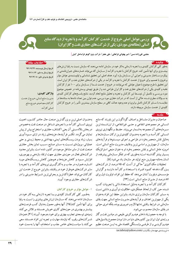 بررسی عوامل اصلی خروج از خدمت کارکنان کارآمد و با تجربه از دیدگاه منابع انسانی (مطالعهی موردی: یکی از شرکتهای حفاری نفت و گاز ایران)