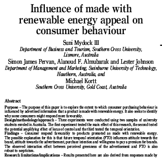 در نظرسنجی اخیر بر پایه مارک های پایدار، 91 درصد از مصرف کنندگان نشان دادند که شرکت ها باید در تصمیم گیری در مورد مسائل اجتماعی و محیطی بیشتر مشغول به کار شوند (مثلا برند های پایدار، 2015). مصرف کنندگان به طور فزاینده ای از مفاهیم مرتبط با انرژی تجدید پذیر مانند ردیابی کربن، انرژی های تجدید پذیر و جبران کربن را نشان می دهند (Polonsky et al.، 2011). این روند شرکت ها را با فرصت های بیشتری برای استخدام مجموعه ای از استراتژی های بازاریابی سبز (Aagerup و Nilsson، 2016) ارائه می دهد. ارائه محصولات با محیط زیست سبز تا کنون، پاسخ به نگرانی مصرف کنندگان در مورد محیط زیست از شرکت های بازاریابی گرا بوده است. به طور معمول، این نام تجاری ساخته شده از مواد بازیافتی است و یا قادر به بازیافت. با این حال، در زمانی که فقدان منابع انرژی محدود برای جامعه بسیار مهم است، این نوع بازاریابی هرگز برای کمک به حل مشکل به هیچ وجه بی ثمر نبوده است. این به این دلیل است که اعتبار سبز محصولات برای محصولات بسیاری تبدیل شده است که معنای آن به عنوان یک مزیت منحصر به فرد برای مصرف کنندگان، یک پدیده شناخته شده به عنوان سبز کردن است. بنابراین نباید جای تعجب باشد که اکثر مصرف کنندگان کالاهای سبز را خریداری نمیکنند حتی اگر اکثریت بزرگی آن را به سطح بالایی از نگرانی در مورد محیط زیست بیان کنند (Bray et al.، 2011). علاوه بر این، بسیاری از شرکت ها تلاش می کنند ادعای بازاریابی انرژی گمراه کننده و شبه سبز یا تجدید پذیر را به عنوان سبکی در نظر بگیرند (جریان سرمایه، 2012).