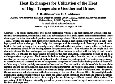 جز اصلی سیستم های ژئوترمال دوگانه مبدل حرارتی است. هنگامی که در سیستم های انرژی زمین گرمایی استفاده می شود، مبدلهای حرارتی پوسته و لوله معمولی باعث مشکلات مربوط به تمیز کردن دندانی از رسوب نمک و محصولات خوردگی می شود. به طور حتم، طول عمر آنها یک سال طول می کشد. برای استفاده از گرما از آب نمک های گرمایی درجه حرارت، یک مبدل حرارتی از نوع لوله در لوله پیشنهاد می شود. مبدل حرارتی این طراحی برای چند سال در مزرعه بخار زمین گرمایی هوا Tern کار می کند؛ در این مبدل حرارتی، پتانسیل حرارتی آب حرارتی سالین به آب شیرین مدار ثانویه سیستم گرمایشی برای خانه های آپارتمانی منتقل می شود. کاهش وزن و اندازه ویژگی های مبدل های حرارتی یک مشکل موضعی است که می تواند با کمک افزایش دهنده های انتقال حرارت حل شود. برای افزایش روند انتقال حرارت در مبدل حرارتی، رطوبت طولی سطح انتقال حرارت پیشنهاد شده است. افزایش سطح انتقال حرارت از طرف حامل حرارتی توسط رینگ باعث افزایش مقدار گرما منتقل شده از عامل گرما می شود. مبدل حرارتی آسان ساختن است و از اجزای تشکیل شده از دو لوله ی محکم قرار داده شده با طول مشخص 3-6 متر، به صورت سریال متصل به یکدیگر تشکیل شده است. روش محاسبه تاثیر تعداد و اندازه رگ های طولی بر انتقال گرما در مبدل حرارتی خوب ارائه شده است و معیار انتخاب تعداد مطلوب و پارامترهای طراحی دنده ها فرموله شده است. برای جلوگیری از خوردگی و رسوب نمک در مبدل حرارتی، استفاده از عامل موثر OEDFK (اکسید اتیلیدیدی-فسفونیک اسید) پیشنهاد شده است. این عامل یک اثر ضد خوردگی و ضد انعطاف پذیری طولانی مدت دارد که به واسطه شکل گیری یک لایه کلات قوی چسبنده برای خشک کردن سطح دشوار است. لایه گذارنده OEDFK با معرفی پالس دوره ای از محلول عامل به محلول نمک در ورودی مبدل حرارتی بازسازی می شود.