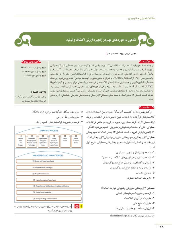 از جمله اهداف مهم قید شده در اسناد بالادستی کشور در بخش نفت و گاز، مدیریت بهینه مخازن با رویکرد صیانتی و بهبود بازیافت است. از این رو توجه ویژه به بخش توسعه و تولید نفت و گاز و بازتعریف زنجیره ارزش اکتشاف و تولید (یا زنجیره ارزش بالادستی) لازم و ضروری است. در این مقاله برخی از فعالیتهای اصلی زنجیره ارزش بالادستی براساس مدل 1PCF از استاندارد 2APQC و با تمرکز به بخش محوری توسعه میادین تشریح میشود. این مقاله قصد دارد تا با بهرهگیری از جدیدترین استانداردهای کلاسهبندی فرآیندها بر پایه مدل مرکز بهرهوری و کیفیت آمریکا (APQC) که در سال 2016 بروز شده است به تشریح برخی از حوزههای مهم و حیاتی زنجیره ارزش بالادستی بپردازد. این زنجیره ارزش به دو بخش فرایندهای عملیاتی- فنی3 و خدمات پشتیبانی و مدیریتی4 تقسیم میشود. زنجیره ارزش تعریف شده شامل 13 بخش است که سهم بخش عملیاتی6 زیر بخش و سهم بخش مدیریتی-پشتیبانی، 7 زیر بخش است.