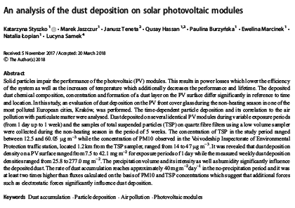 ذرات جامد عملکرد ماژول های فتوولتائیک (PV) را مختل می کنند. این امر منجر به از دست دادن قدرت می شود که کارایی سیستم را کاهش می دهد و همچنین افزایش دما که علاوه بر کاهش عملکرد و طول عمر نیز می باشد. ترکیب شیمیایی گرد و غبار، غلظت و تشکیل یک لایه گرد و غبار در سطح PV به طور قابل توجهی با توجه به زمان و مکان متفاوت است. در این مطالعه، ارزیابی رسوب گرد و غبار روی شیشه جلویی PV در طی فصل غیر گرمایش در یکی از آلوده ترین شهرهای اروپایی کراکوف انجام شد. رسوب ذرات وابسته به زمان و ارتباط آن با آلودگی هوا با ذرات جامد مورد تجزیه و تحلیل قرار گرفت. گرد و غبار در چندین واحد ماژول PV در طی دوره های مختلف مواجه شدن (از 1 روز تا 1 هفته) و نمونه های ذرات معلق (TSP) بر روی فیبرهای کوارتز با استفاده از نمونه ی کم حجم در طی فصل غیر گرمایش در دوره از 5 هفته غلظت TSP در دوره مطالعه در محدوده بین 12.5 و 60.05μgm-3 بود در حالیکه غلظت PM10 در ناحیه ترافیک محافظت از محیط زیست وووود، که در فاصله 1.2 کیلومتر از نمونه نمونه TSP قرار داشت، بین 14 تا 47μgm-3بود. مشخص شد که تراکم رسوب گرد و غبار در سطح PV از 7 7 به 1 0 42 1 میلی گرم در مترمربع برای مدت زمان قرار گرفتن در معرض 1 روز در حالی که تراکم رسوب گرد و غبار هفتگی اندازه گیری شده از 25.8 تا 277.0 میلی گرم در متر مربع است. حجم بارش و شدت آن و همچنین رطوبت به طور قابل توجهی بر گرد و غبار تاثیر می گذارد. میزان انباشت گرد و غبار در دوره بدون بارش تقریبا 40 میلی گرم در مترمربع-2 در روز-1 است و حداقل دو بار بیشتر از فواصل محاسبه شده بر اساس PM10 و TSP است که نشان می دهد نیروهای اضافی مانند نیروهای الکترواستاتیک به طور قابل توجهی نفوذ گرد و غبار