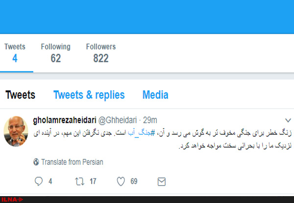 این عضو شورای مرکزی فراکسیون امید مجلس نوشت: «زنگ خطر برای جنگی مخوفتر به گوش میرسد و آن، «جنگ آب» است. جدی نگرفتن این مهم، در آیندهای نزدیک ما را با بحرانی سخت مواجه خواهد کرد.»