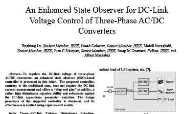 در این مقاله، یک استراتژی ساده کنترل ولتاژ لینک DC مبتنی بر ESO برای مبدل AC DC سه فاز پیشنهاد شده است. با استراتژی کنترل پیشنهادی، از سنسورهای اضافی برای بهبود پاسخ دینامیک سیستم تحت اغتشاش جلوگیری شده بود، که برای plug and play و گسترش ماژول ها و ریزشبکه های UPS مناسب بود. کنترل کننده ولتاژ لینک DC مبتنی بر ESO پیشنهاد شده، می تواند همان اثر را در کاهش تغییرات ولتاژ لینک DC با کنترل پیش فرض مبتنی بر سنسور داشته باشد، اما دارای اثر بهتری در کاهش زمان نشست می باشد. مقاومت کنترل کننده در آزمایش به خوبی بررسی شده است. نتایج تجربی اثربخشی استراتژی کنترل پیشنهادی را نشان دادند.