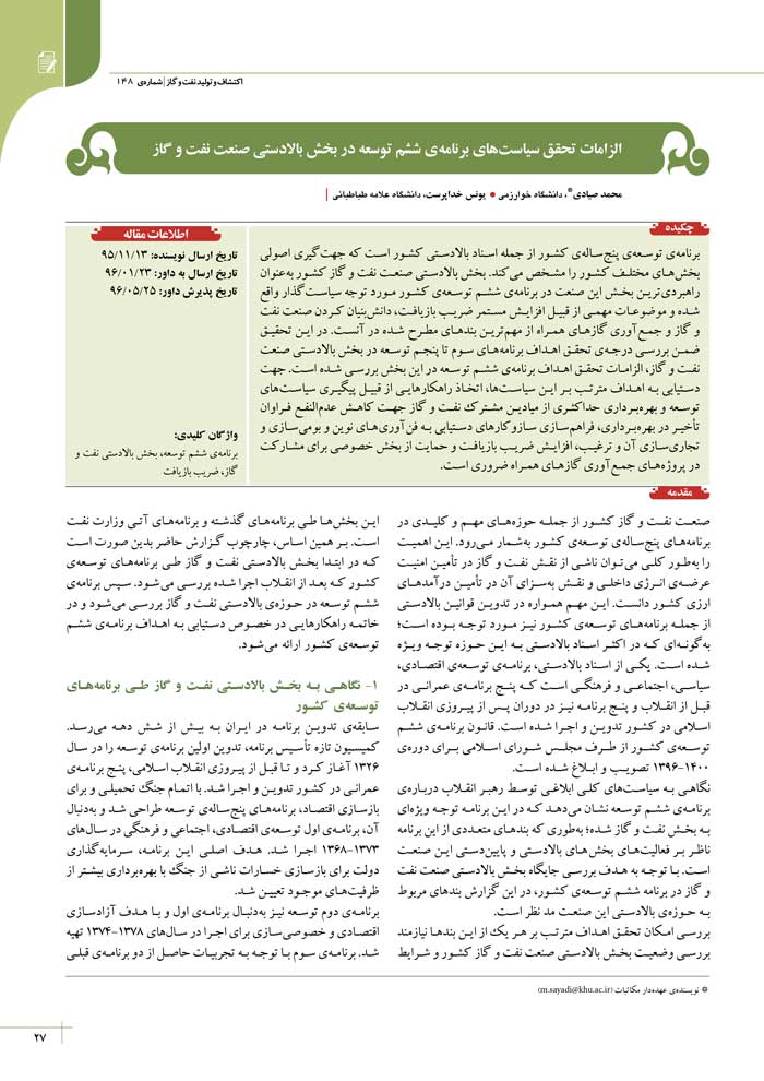 الزامات تحقق سیاستهای برنامه ی ششم توسعه در بخش بالادستی صنعت نفت و گاز