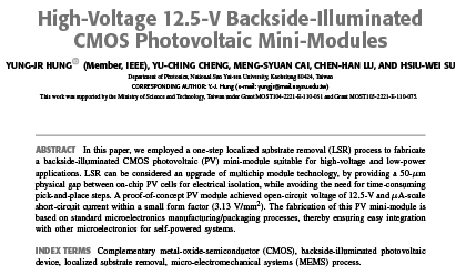 این مقاله یک ماژول کوچک CMOS PV ولتاژ بالا را ارائه می کند که با استفاده از فرآیند تک مرحله ای LSR ساخته شده است. ماژول PV پیشنهادی دارای ویژگی های ولتاژ ندار باز قابل تنظیم (۰٫۵ تا ۱۲٫۵ ولت) و جریان اتصال کوتاه در مقیاس میکرو آمپر در یک ضریب شکل دهی کوچک با ولتاژ مدار باز ویژه &lt.Voc&gt. به میزان ۳٫۱۳ V mm2 است. تنها ۲۵ سلول PV واقع بر روی تراشه به صورت متوالی در نمایش اثبات مفهوم به یکدیگر متصل شده اند؛ با این حال، روش LSR پیشنهادی می تواند برای اتصال به تعداد زیادی سلول PV بر روی یک تراشه به منظور تقویت ولتاژ خروجی بدون نیاز به مراحل بیشتر مورد استفاده قرار بگیرد