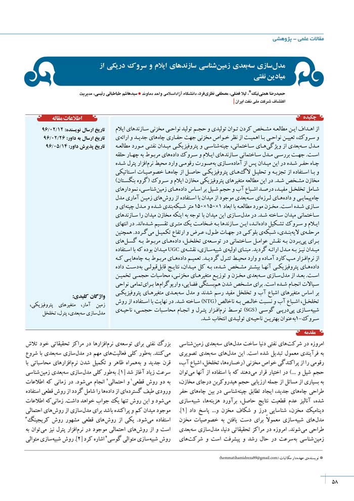 از اهداف این مطالعه مشخص کردن توان تولیدی و حجم تولید نواحی مخزنی سازندهای ایلام و سروک، تعیین نواحی با اهمیت از نظر خواص مخزنی جهت حفاری چاههای جدید و ارائهی مدل سهبعدی از ویژگیهای ساختمانی، چینهشناسی و پتروفیزیکی میدان نفتی مورد مطالعه است. جهت بررسی مدل ساختمانی سازندهای ایلام و سروک دادههای مربوط به چهار حلقه چاه حفر شده در این میدان پس از آمادهسازی بهصورت رقومی وارد محیط نرمافزار پترل شده و با استفاده از تجزیه و تحلیل لاگهای پتروفیزیکی حاصل از چاهها خصوصیات استاتیکی مخازن مشخص شد. در این مطالعه متغیرهای پتروفیزیکی مخازن ایلام و سروک (گروه بنگستان) شامل تخلخل مفید، درصد اشباع آب و حجم شیل بر اساس دادههای زمینشناسی، نمودارهای چاهپیمایی و دادههای لرزهای سهبعدی موجود از میدان با استفاده از روشهای زمین آماری مدل سازی شده است. مخزن مورد مطالعه با ابعاد 1×150×150 متر شبکهبندی شده و مدل چینهای و ساختمانی میدان ساخته شد. در مدلسازی این میدان با توجه به اینکه مخازن میدان را سازندهای ایلام و سروک تشکیل دادهاند، این سازندها به ضخامت یک متری تقسیم شدهاند. در انتهای مرحلهی لایهبندی، شبکهی بلوکی در جهات طول، عرض و ارتفاع تکمیل میگردد. همچنین برای پیبردن به نقش عوامل ساختمانی در توسعهی تخلخل، دادههای مربوط به گسلهای میدان نیز به مدل ارائه گردید. مبنای اولیهی شبیهسازی، نقشهی UGC میدان بوده که با استفاده از نرمافزار مپکارد آماده و وارد محیط تترل گردید. تعمیم دادههای مربوط به چاههایی که دادههای پتروفیزیکی آنها بیشتر مشخص شده، به کل میدان، نتایج قابلقبولی بهدست داده است. بعد از مدلسازی سهبعدی مخزن و توزیع متغیرهای مخزنی، ﻣﺤﺎﺳﺒﺎت حجمی تخمین سیالات انجام شده اﺳﺖ. ﺑﺮای مشخص ﺷﺪن همبستگی ﻓﻀﺎیﯽ، واریﻮﮔﺮامﻫﺎ برایﺗﻤﺎﻣﯽ نواحی ﺑﺮ اﺳﺎس ﻣﺘﻐﯿﺮﻫﺎی اﺷﺒﺎع آب و ﺗﺨﻠﺨﻞ ﻣﻔﯿﺪ رﺳﻢ ﺷﺪﻧﺪ و ﻣﺪل ﺳﻪبعدی متغیرهای پتروفیزیکی تخلخل، اشباع آب و نسبت خالص به ناخالص (NTG) ساخته شد. در نهایت با استفاده از روش شبیهسازی پیدرپی گوسی (SGS) توسط نرمافزار پترل و انجام محاسبات حجمی، ناحیهی سروک-1بهعنوان بهترین ناحیهی تولیدی انتخاب شد.