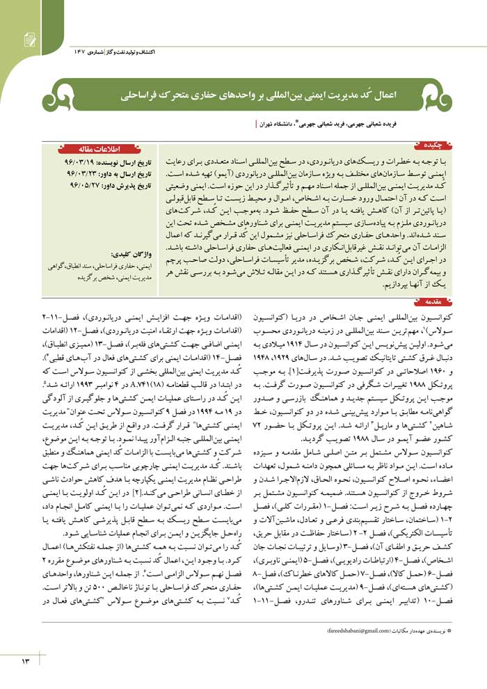 با توجه به خطرات و ریسکهای دریانوردی، در سطح بینالمللی اسناد متعددی برای رعایت ایمنی توسط سازمانهای مختلف به ویژه سازمان بینالمللی دریانوردی (آیمو) تهیه شده است. کد مدیریت ایمنی بینالمللی از جمله اسناد مهم و تاثیرگذار در این حوزه است. ایمنی وضعیتی است که در آن احتمال ورود خسارت به اشخاص، اموال و محیط زیست تا سطح قابلقبولی (یا پائینتر از آن) کاهش یافته یا در آن سطح حفظ شود. بهموجب این کد، شرکتهای دریانوردی ملزم به پیادهسازی سیستم مدیریت ایمنی برای شناورهای مشخص شده تحت این سند شدهاند. واحدهای حفاری متحرک فراساحلی نیز مشمول این کد قرار میگیرند که اعمال الزامات آن میتواند نقش غیرقابلانکاری در ایمنی فعالیتهای حفاری فراساحلی داشته باشد. در اجرای این کد، شرکت، شخص برگزیده، مدیر تاسیسات فراساحلی، دولت صاحب پرچم و بیمهگران دارای نقش تاثیرگذاری هستند که در این مقاله تلاش میشود به بررسی نقش هر یک از آنها بپردازیم.