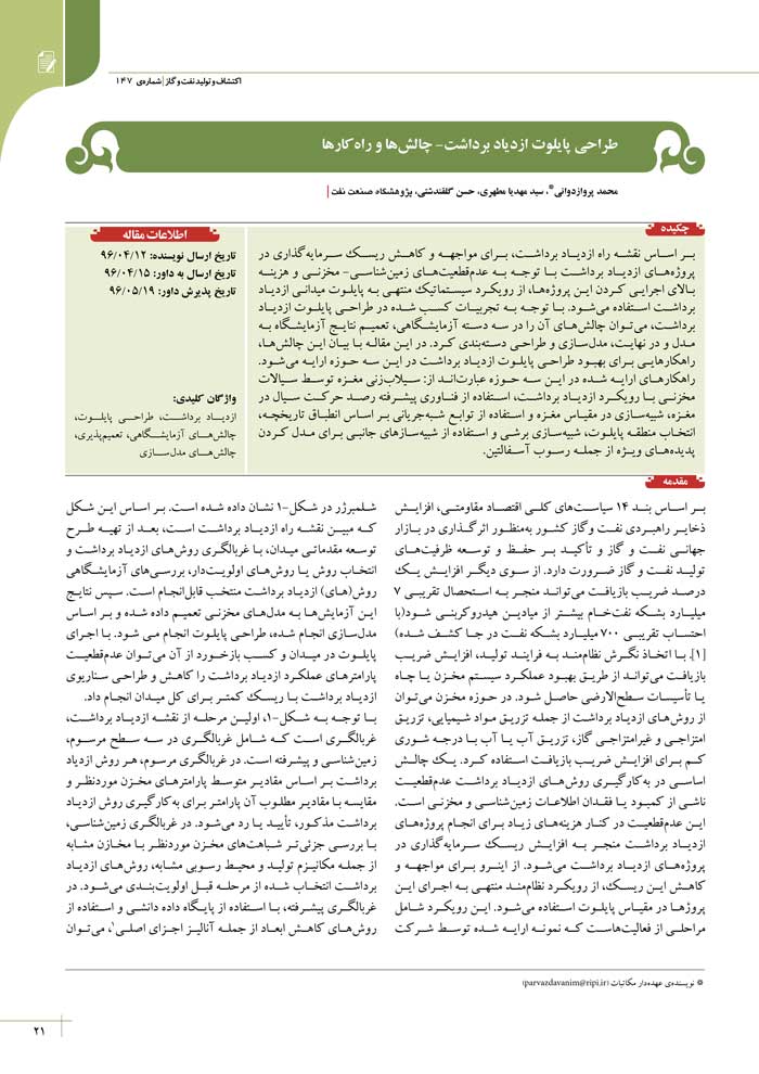 بر اساس نقشه راه ازدیاد برداشت، برای مواجهه و کاهش ریسک سرمایهگذاری در پروژههای ازدیاد برداشت با توجه به عدمقطعیتهای زمینشناسی- مخزنی و هزینه بالای اجرایی کردن این پروژهها، از رویکرد سیستماتیک منتهی به پایلوت میدانی ازدیاد برداشت استفاده میشود. با توجه به تجربیات کسب شده در طراحی پایلوت ازدیاد برداشت، میتوان چالشهای آن را در سه دسته آزمایشگاهی، تعمیم نتایج آزمایشگاه به مدل و در نهایت، مدلسازی و طراحی دستهبندی کرد. در این مقاله با بیان این چالشها، راهکارهایی برای بهبود طراحی پایلوت ازدیاد برداشت در این سه حوزه ارایه میشود. راهکارهای ارایه شده در این سه حوزه عبارتاند از: سیلابزنی مغزه توسط سیالات مخزنی با رویکرد ازدیاد برداشت، استفاده از فناوری پیشرفته رصد حرکت سیال در مغزه، شبیهسازی در مقیاس مغزه و استفاده از توابع شبهجریانی بر اساس انطباق تاریخچه، انتخاب منطقه پایلوت، شبیهسازی برشی و استفاده از شبیهسازهای جانبی برای مدل کردن پدیدههای ویژه از جمله رسوب آسفالتین.