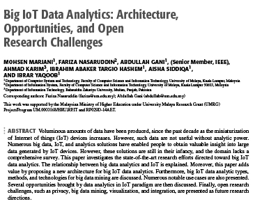 از دهه گذشته، با افزایش مینیاتوری شدن وسایل (دیوایس) اینترنت اشیا (IoT)، حجم وسیعی از داده ها تولید شده است. اما، چنین داده هایی بدون قدرت تحلیلی، مفید نیستند. داده های بزرگ متعدد، IoT، و راه حل های تحلیلی، امکان دستیابی افراد به بینش های ارزشمند راجع به داده های بزرگ تولید شده توسط وسایل IoT را فراهم آورده اند. اما، این راه حل ها هنوز در مراحل اولیه بوده، و این حوزه تحت بررسی جامعی قرار نگرفته است. این مقاله به پژوهش تلاشهای تحقیقاتی پیشرفته در راستای تحلیل داده های بزرگ در IoT می پردازد. در اینجا راجع به رابطه بین تحلیل داده های بزرگ وIoT توضیح داده شده است. به علاوه، این مقاله با پیشنهاد معماری جدید برای تحلیل داده های بزرگ در IoT ، ارزش افزوده حاصل می نماید. ضمنا، راجع به انواع تحلیلی داده های بزرگ درIoT ، روشها، و تکنولوژیهای داده کاوی بحث شده است. موارد کاربردی برجسته متعددی نیز مطرح شده است. سپس راجع به فرصتهای مختلف حاصله از تحلیل داده ها در پارادایم IoT بحث شده است. بالاخره، چالش های باز تحقیق ، نظیر حریم خصوصی، داده کاوی داده های بزرگ، تجسم، و ادغام، به عنوان جهات تحقیق آتی مطرح شده است.