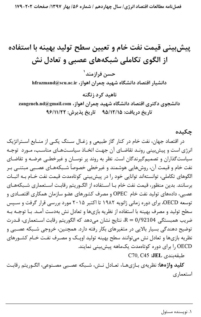 پیشبینی قیمت نفت خام و تعییین سطح تولید بهینه با استفاده از الگوی تکاملی شبکههای عصبی و تعادل نش