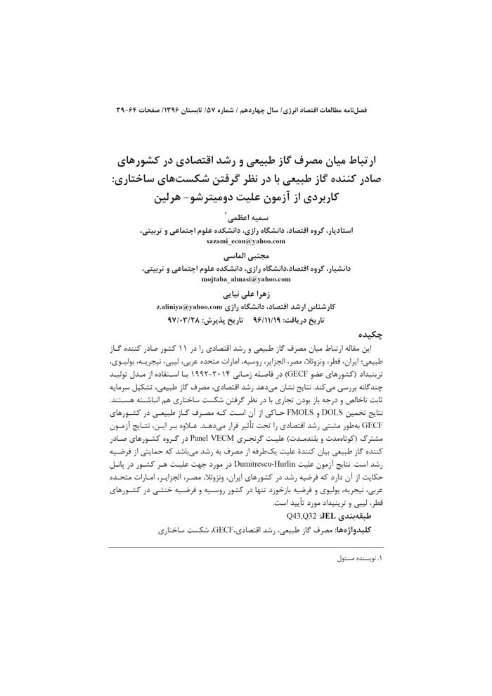 ارتباط میان مصرف گاز طبیعی و رشد اقتصادی در کشورهای صادر کننده گاز طبیعی با در نظر گرفتن شکستهای ساختاری کاربردی از آزمون علیت دومیترشو- هرلین