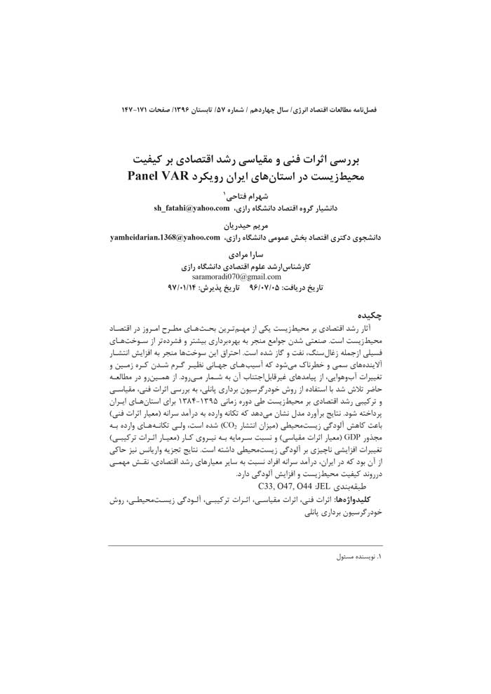 بررسی اثرات فنی و مقیاسی رشد اقتصادی بر کیفیت محیطزیست در استانها ایران رویکرد panei VAR