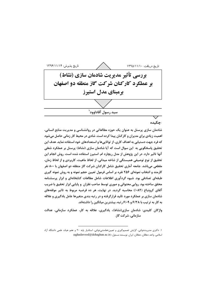 بررسی تاثیر مدیریت شادمان سازی (نشاط) در عملکرد کارکنان شرکت گاز منطقه دو اصفهان بر مبنای مدل استیرز