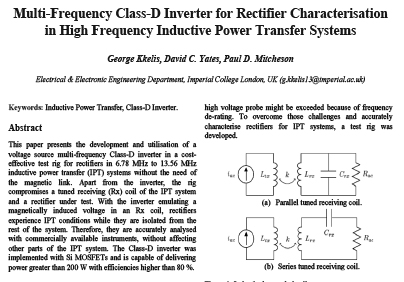 اینورتر کلاس D منبع ولتاژی برای اولین بار در تجهیزات آزمایشی شناسایی یکسوساز IPT مستقل از پیوند مغناطیسی استفاده شد. تجهیزات آزمایشی ابداعشده موجب میشود سنجش توان ac با پروب های ولتاژ و جریان پسیو موجود در بازار عملی شود درحالیکه شرایط IPT را برای مدارهای در حال آزمایش هم فراهم میکند. با درایورهای گیت موج مربعی، اینورتر دارای توانایی چند فرکانسی بوده و قادر به تامین شکل موج خروجی ولتاژ در محدود ۶٫۷۸ تا ۱۳٫۵۶ مگاهرتز است. بایاس منفی برای حذف روشن شدن پارازیتی از نرخهای dv dt بالا ضروری است. تکنیکهایی بهکاررفتهاند که تلفات روشن شدن معمول و مشاهدهشده در توپولوژیهای کلاس D از بین میبرند. اینورتر پیاده شده قادر به ارسال سطوح توان بیشتر از ۲۰۰ وات در یکسوسازهای آزمایشی با بازده اوج بیشتر از ۸۰ % بود. تلفات درایو گیت، ۱۰ % از تلفات کلی را تشکیل میداد که عمده آن تلفات هدایت بود. افزایش پتانسیل در بازده اینورتر میتواند از تعویض MOSFET های سیلیکونی با ترانزیستورهای گالیم نیتریدی حاصل شود.