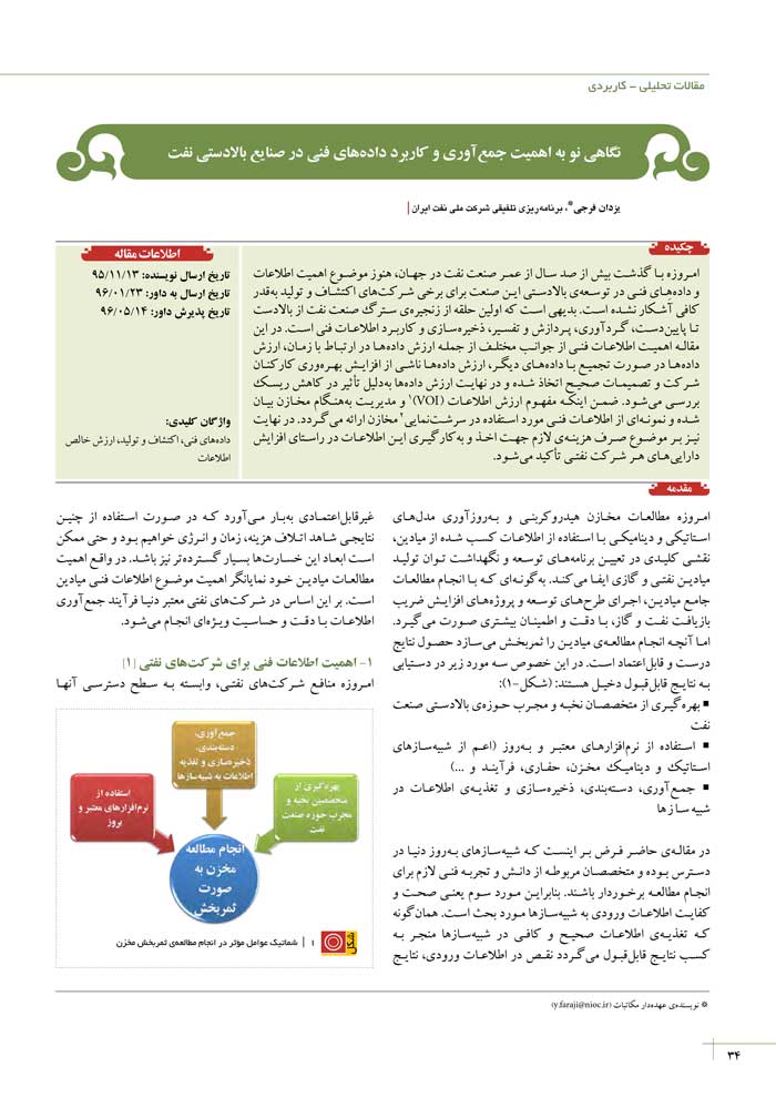 امروزه با گذشت بیش از صد سال از عمر صنعت نفت در جهان، هنوز موضوع اهمیت اطلاعات و داده‏های فنی در توسعه‌ی بالادستی این صنعت برای برخی شرکت‏های اکتشاف و تولید به‌قدر کافی آشکار نشده است. بدیهی است که اولین حلقه از زنجیره‌ی سترگ صنعت نفت از بالادست تا پایین‌دست، گردآوری، پردازش و تفسیر، ذخیره‌سازی و کاربرد اطلاعات فنی است. در این مقاله اهمیت اطلاعات فنی از جوانب مختلف از جمله ارزش داده‏ها در ارتباط با زمان، ارزش داده‏ها در صورت تجمیع با داده‏های دیگر، ارزش داده ‏ها ناشی از افزایش بهره ‏وری کارکنان شرکت و تصمیمات صحیح اتخاذ شده و در نهایت ارزش داده ‏ها به‌دلیل تاثیر در کاهش ریسک بررسی می‏شود. ضمن اینکه مفهوم ارزش اطلاعات (VOI)1 و مدیریت به‏هنگام مخازن بیان شده و نمونه‏ای از اطلاعات فنی مورد استفاده در سرشت ‏نمایی2 مخازن ارائه می‏گردد. در نهایت نیز بر موضوع صرف هزینه ‏ی‌ لازم جهت اخذ و به‏کارگیری این اطلاعات در راستای افزایش دارایی‏ های هر شرکت نفتی تاکید می‏شود.