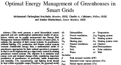 یک روش کنترل سلسله مراتبی برای عملکرد بهینه گلخانه در بدنه شبکه های هوشمند پیشنهاد شد، که شامل مدل های ریاضیاتی زیادی برای عملکرد بهینه برنامه ریزی برق، گاز و سیستم های گرمایش گلخانه بود. بنابراین مدلهای بهینه سازی برای عملکرد بهینه نوردهی مکمل، تولید CO2، گردش هوا و تهویه، و سیستم های گرمایش و سرمایش در سیستم های کنترل موجود در گلخانه ها فرمول بندی شد. مدل توسعه داده شده از پیش بینی های هوا، اطلاعات هزینه برق و تنظیمات کاربر برای مینیمم کردن هزینه انرژی کل و شارژ پیک تقاضا در عین در نظر گرفتن پارامترهای مهم کنترل هوای گلخانه استفاده می کند. نتایج شبیه سازی های ارائه شده، موثر بودن مدل پیشنهادی در کاهش هزینه کلی در عین حفظ قیدهای گلخانه، حتی در شرایط عدم اطمینان را نشان می دهد.