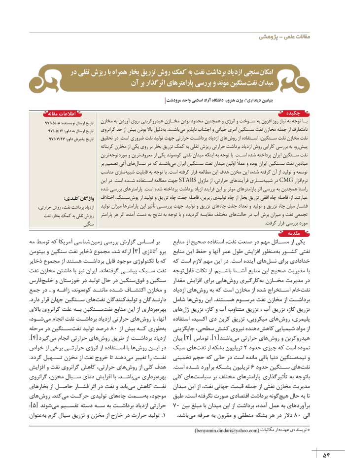 امکانسنجی ازدیاد برداشت نفت به کمک روش تزریق بخار همراه با ریزش تقلی در میدان نفتسنگین موند و بررسی پارامترهای اثرگذار بر آن