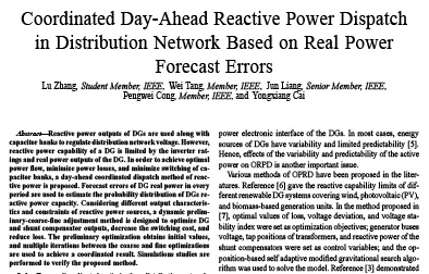 با در نظر گرفتن توان حقیقی پیش بینی شده ی DGها، رنج های توان راکتیو بهتر مشخص شده است و برای انتقال توان راکتیو روز جاری شبکه های توزیع استفاده شد. در عمل خطاهای توان حقیقی پیش بینی شده برای تخمین توزیع احتمال توان راکتیو خروجی های قابل دسترس برای دستیابی به شارش توان بهینه، کاهش تلفات استفاده شد. یک روش قابل تنظیم دقیق – بحرانی پیشنهاد شده است که محدودیت های توان راکتیو خروجی DGها و طول عمر جبران سازهای موازی را در نظر می گیرد. ظرفیت خروجی DG در بهینه سازی بحرانی، توان راکتیو جبرانسازهای موازی در نظر گرفته شده است. بنابراین تعداد سوییچینگ می تواند کاهش یابد که این امر موجب افزایش طول عمر تجهیزات سرویس و کاهش هزینه های جبرانساز می شود. در بهینه سازی دقیق، DGها می توانند به صورت متعادل انحراف توان راکتیو را منظم نماییند زیرا طرح جبرانساز موازی ابتدایی قبل از تنظیم دقیق تولید شده است. بنابراین تلفات شبکه و انحراف ولتاژ کمتر می شود. تکرارهای متعدد بین تنظیم جبرانسازهای موازی گسسته و تنظیم DG پیوسته برای دستیابی به هماهنگی به کار برده شده اند. بنابراین انتقال توان راکتیو بهینه ی کلی به منظور افزایش نرخ استفاده ی توان راکتیو DG و کاهش تلفات و هزینه های تلفات و کاهش هزینه های سوییچینگ جبرانسازهای موازی به دست آمده اند.