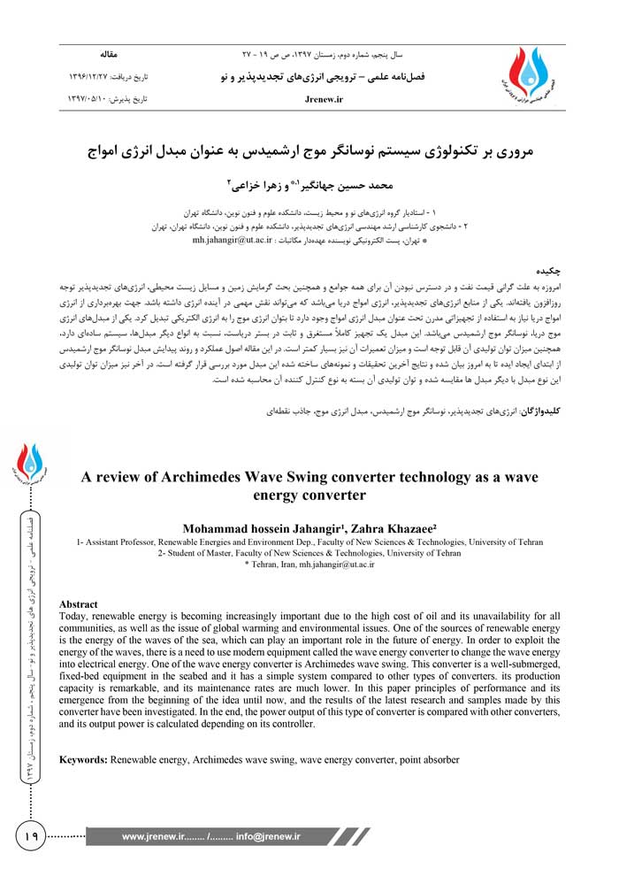 امروزه به علت گرانی قیمت نفت و در دسترس نبودن آن برای همه جوامع و همچنین بحث گرمایش زمین و مسایل زیست محیطی، انرژی های تجدیدپذیر توجه روزافزون یافتهاند. یکی از منابع انرژی های تجدیدپذیر، انرژی امواج دریا میباشد که میتواند نقش مهمی در آینده انرژی داشته باشد. جهت بهره برداری از انرژی امواج دریا نیاز به استفاده از تجهیزاتی مدرن تحت عنوان مبدل انرژی امواج وجود دارد تا بتوان انرژی موج را به انرژی الکتریکی تبدیل کرد. یکی از مبدلهای انرژی موج دریا، نوسانگر موج ارشمیدس¹ میباشد. این مبدل یک تجهیز کاملا مستغرق و ثابت در بستر دریاست، نسبت به انواع دیگر مبدلها، سیستم سادهای دارد، همچنین میزان توان تولیدی آن قابل توجه است و میزان تعمیرات آن نیز بسیار کمتر است. در این مقاله اصول عملکرد و روند پیدایش مبدل نوسانگر موج ارشمیدس از ابتدای ایجاد ایده تا به امروز بیان شده و نتایج آخرین تحقیقات و نمونههای ساخته شده این مبدل مورد بررسی قرار گرفته است. در آخر نیز میزان توان تولیدی این نوع مبدل با دیگر مبدل ها مقایسه شده و توان تولیدی آن بسته به نوع کنترل کننده آن محاسبه شده است.