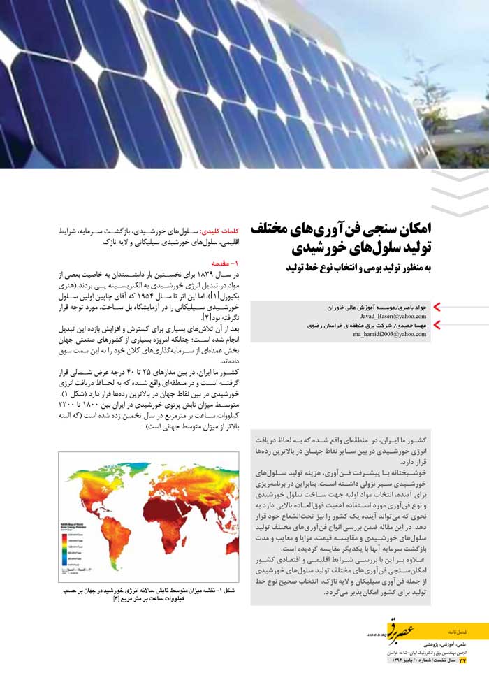 کشور ما ایران، در منطقهای واقع شده که به لحاظ دریافت انرژی خورشیدی در بین سایر نقاط جهان در بالاترین رده ها قرار دارد. خوشبختانه با پیشرفت فنآوری، هزینه تولید سلول های خورشیدی سیر نزولی داشته است. بنابراین در برنامهریزی برای آینده، انتخاب مواد اولیه جهت س�اخت سلول خورشیدی و نوع فنآوری مورد استفاده اهمیت فوقالعاده بالایی دارد به نحوی که میتواند آینده یک کشور را نیز تحتالشعاع خود قرار دهد. در این مقاله ضمن بررسی انواع فنآوریهای مختلف تولید سلولهای خورشیدی و مقایسه قیمت، مزایا و معایب و مدت بازگشت سرمایه آنها با یکدیگر مقایسه گردیده است. علاوه بر این با بررسی شرایط اقلیمی و اقتصادی کشور امکان سنجی فنآوریهای مختلف تولید سلولهای خورشیدی از جمله فنآوری سیلیکان و لایه نازک، انتخاب صحیح نوع خط تولید برای کشور امکان پذیر میگردد.