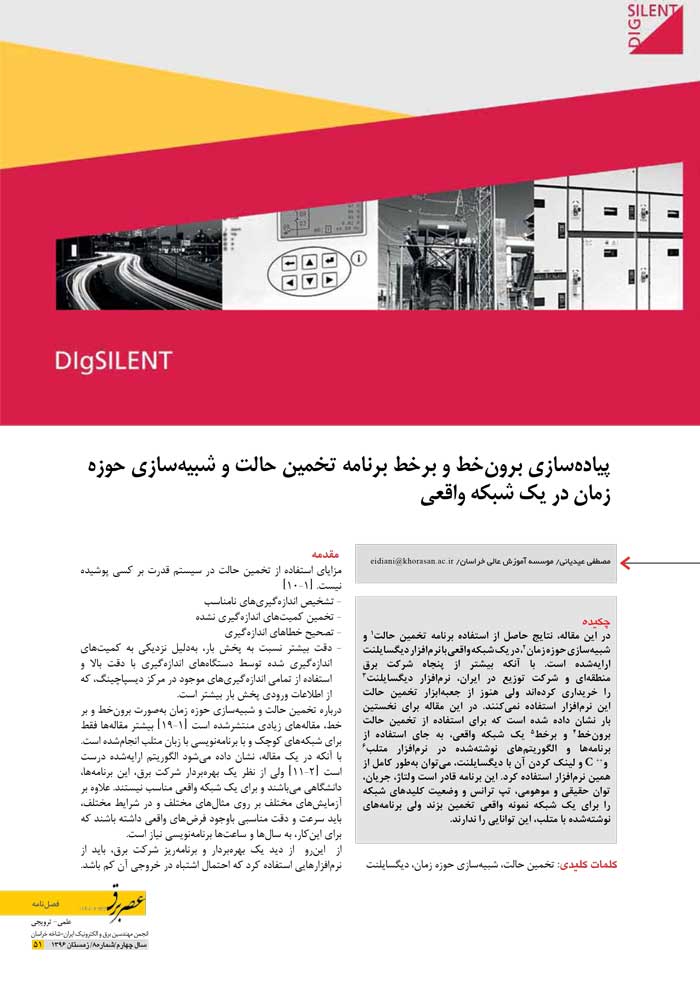 در این مقاله، نتایج حاصل از استفاده برنامه تخمین حالت و شبیهسازی حوزه زمان، در یک شبکه واقعی با نرمافزار دیجسایلنت ارائهشده است. با آنکه بیشتر از پنجاه شرکت برق منطقهای و شرکت توزیع در ایران، نرمافزار دیجسایلنت را خریداری کردهاند ولی هنوز از جعبهابزار تخمین حالت این نرمافزار استفاده نمیکنند. در این مقاله برای اولین بار نشان دادهشده است که برای استفاده از تخمین حالت برونخط و بر خط یک شبکه واقعی، به جای استفاده از برنامهها و الگوریتمهای نوشتهشده در نرمافزار متلب و C++ و لینک کردن آن با دیجسایلنت، میتوان تماما از همین نرمافزار استفاده کرد. این برنامه قادر است ولتاژ، جریان، توان حقیقی و موهومی، تپ ترانس و وضعیت کلیدهای شبکه را برای یک شبکه نمونه واقعی تخمین بزند ولی برنامههای نوشتهشده با متلب، این توانایی را ندارند.