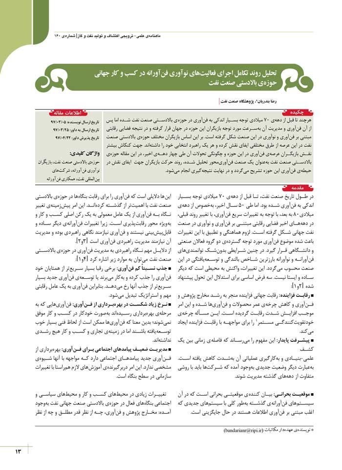 تحلیل روند تکامل اجرای فعالیتهای نوآوری فنآورانه در کسب و کار جهانی حوزهی بالادستی صنعت نفت
