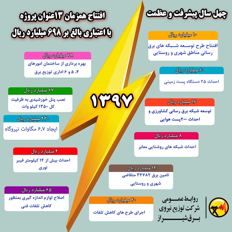 جلال زراعت پیشه مدیرعامل توزیع نیروی برق شیراز ، گفت: امسال سالگرد پیروزی انقلاب را با شعار چهل سال پیشرفت و عظمت، افتخار به گذشته، امید به آینده گرامی خواهیم داشت و در این راستا، 13 عنوان پروژه با اعتباری بالغ بر 698 میلیارد ریال در مجموعه مدیریتی توزیع برق شیراز افتتاح خواهد شد.