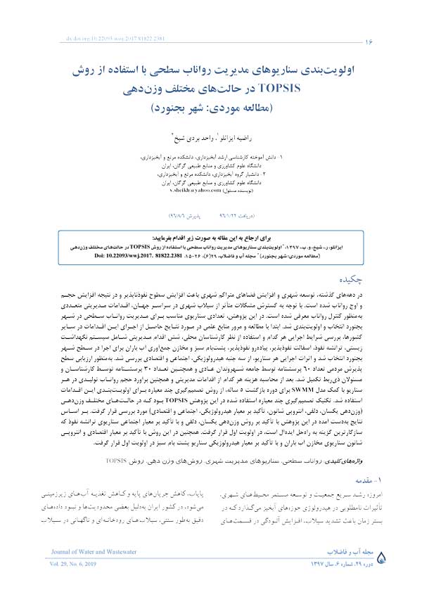 اولویت بندی سناریوهای مدیریت رواناب سطحی با استفاده از روش TOPSIS در حالت های مختلف وزن دهی (مطالعه موردی: شهر بجنورد)