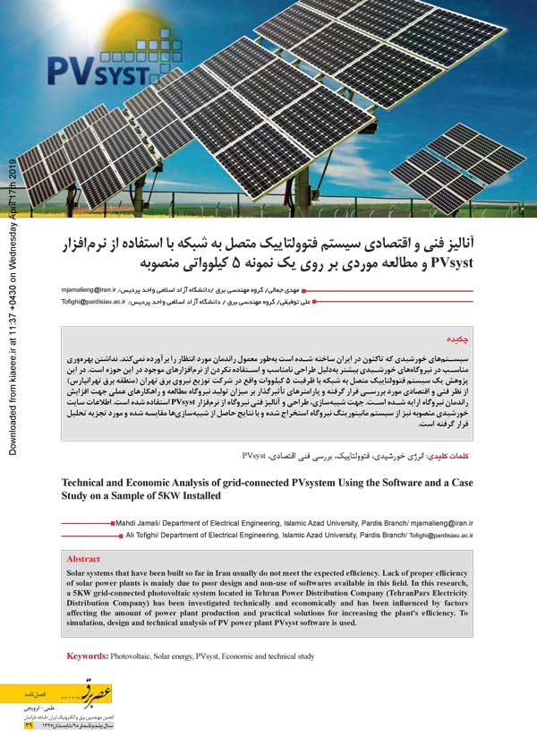 آنالیز فنی و اقتصادی سیستم فتوولتائیک متصل به شبکه با استفاده از نرم افزار pvsyst و مطالعه موردی بر روییک نمونه 5 کیلوواتی منصوبه