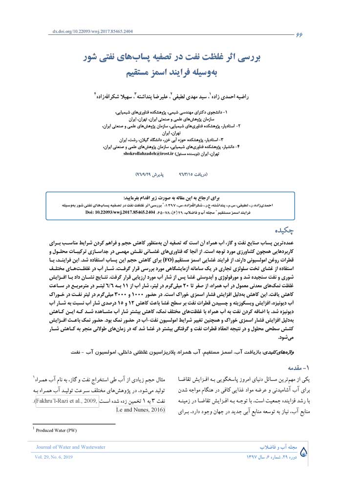 بررسی اثر غلظت نفت در تصفیه پسابهای نفتی شور بهوسیله فرایند اسمز مستقیم