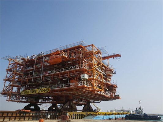 آخرین عرشه دریایی فاز ۱۴ پارس جنوبی به منظور انتقال و نصب در موقعیت مخزنی بلوک مشترک گازی ایران و قطر از یارد شرکت صنعتی دریایی ایران بارگیری شد.
