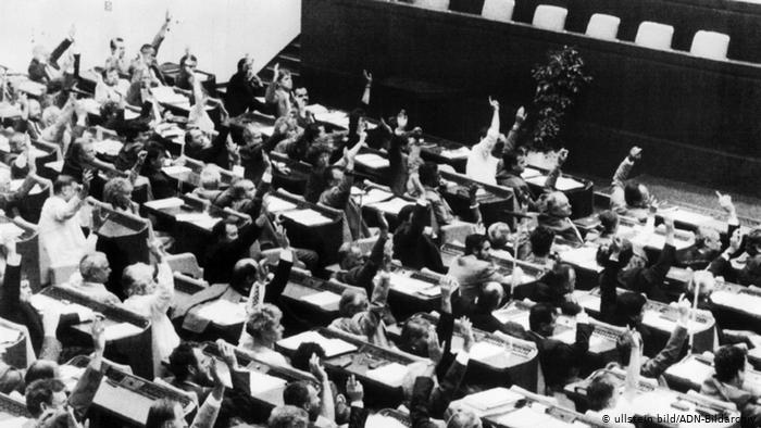 لایحه پیوستن آلمان شرقی به آلمان فدرال بیست و سوم اوت سال ۱۹۹۰: مجلس نمایندگان آلمان شرقی (Volkskammer) لایحه پیوستن جمهوری دمکراتیک آلمان را به آلمان فدرال تصویب کرد. گرگور گیزی، رئیس حزب متحد سوسیالیستی آلمان (SED) اعلام کرد که مجلس نمایندگان سرنگونی آلمان دمکراتیک را تصویب کرده است.