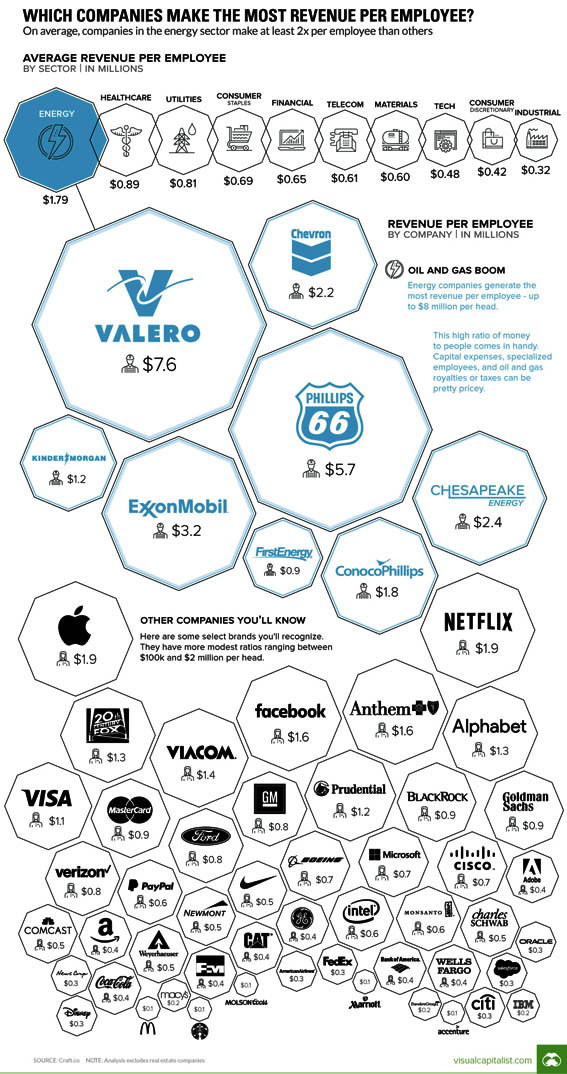 در نموداری که درامد شرکت های بزرگ به ازای هر کارمند را نشان می دهد، شرکت های نفتی با وجود چالش های صنعت نفت در صدر سوددهی قرار دارند. شرکت والرودر صدر قرار دارد، شورون، اکسون مبیل نیز در رده های بعدی قرار دارند.