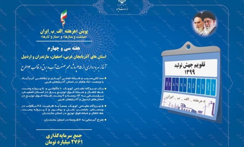 25 پروژه صنعت آب و برق با اعتبار دو هزار و 761 میلیارد تومان در چهار استان آذربایجانغربی، اردبیل، اصفهان و مازندران در هفته سی و چهارم پویش #هرهفته_الف_ب_ایران با حضور ویدئوکنفرانسی رئیس جمهور و وزیر نیرو افتتاح شد.