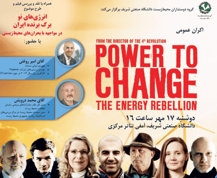 گروه دوستداران محیط زیست دانشگاه صنعتی شریف در نظر دارد به همراه پخش فیلم `قدرت تغییر–انقلاب انرژی` ، پنلی تخصصی با حضور امیر روغنی یکی از شخصیت‌های اصلی فیلم که یک کارآفرین ایرانی ساکن آلمان است، برگزار نماید.