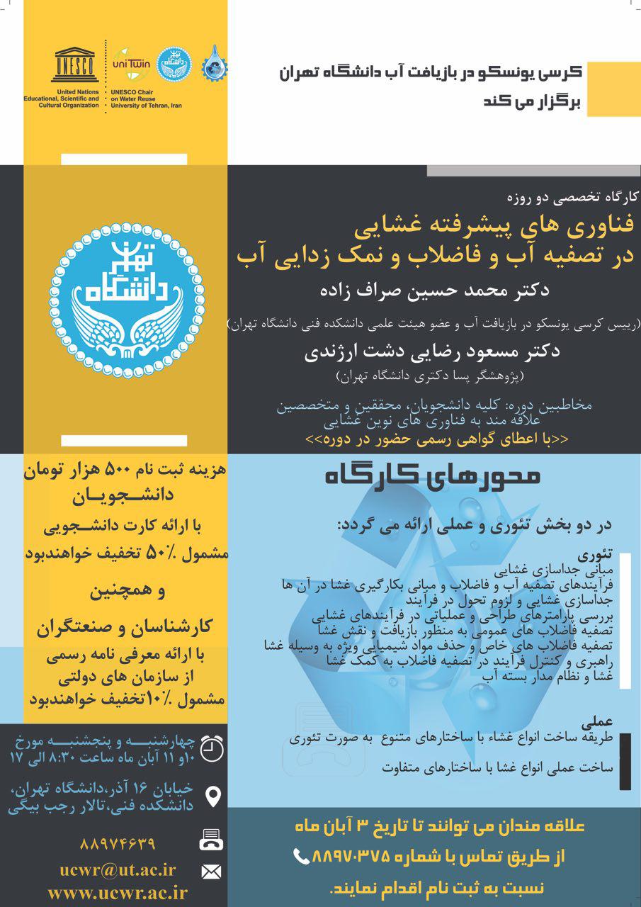 این کارگاه با حضور دکتر محمد حسین صراف زاده، رییس کرسی یونسکو در بازیافت آب و عضو هیات علمی دانشکده فنی دانشگاه تهران و همچنین دکتر مسعود رضایی دشت ارژندی، پژوهشگر پسادکتری دانشگاه تهران، دهم و یازدهم آبان ماه در دانشکده فنی دانشگاه تهران برگزار میشود.