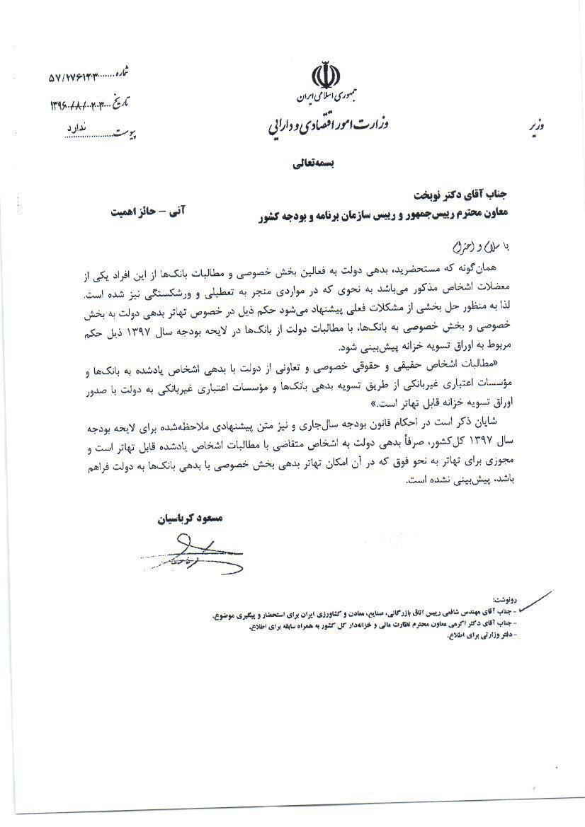به گزارش انرژی امروز، مسعود کرباسیان پیشنهادی کرده است که این تهاتر در بودجه سال 1397 ذیل حکم مربوط به اوراق تسویه خزانه لحاظ شود.